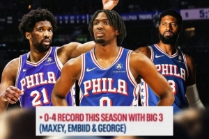 本场比赛恩比德、乔治、马克西三人全部出战,本赛季此前这三位球员同时出战时,76人的战绩为0胜4负,上赛季为7胜8负。