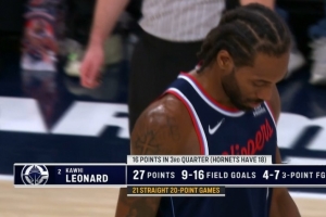 (注:伦纳德个人最长纪录为连续22场得分20+)