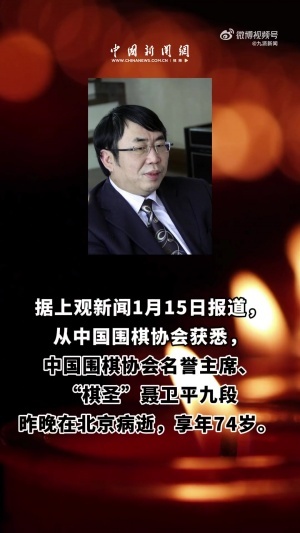 体育资讯01月15日讯 中国围棋协会名誉主席、“棋圣”聂卫平九段昨晚在北京病逝,享年74岁。