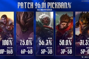 26.01版本第一赛段开赛至今打野英雄禁选率一览,其中杰斯禁选率达到100%;